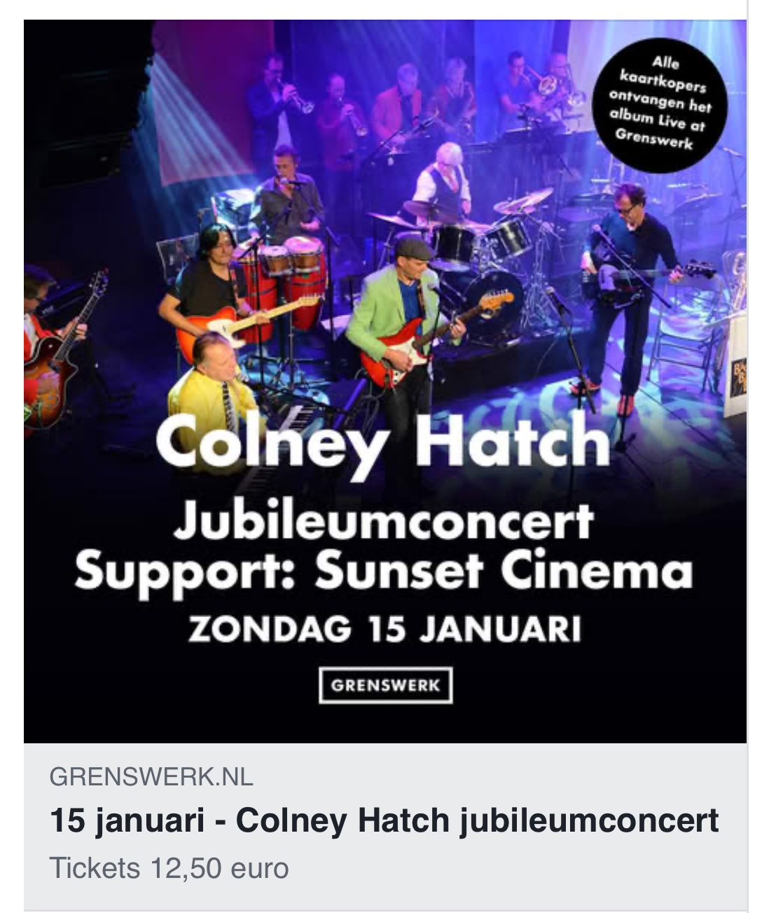 Het concert is op zondag 15 januari 2023. Colney Hatch en Sunset Cinema, de ene band opgericht in 1973 en de andere in 2019, zoeken elkaar in Grenswerk nadrukkelijk op. Ze geven eigen interpretaties aan elkaars repertoire en wisselen muzikanten uit.